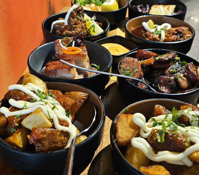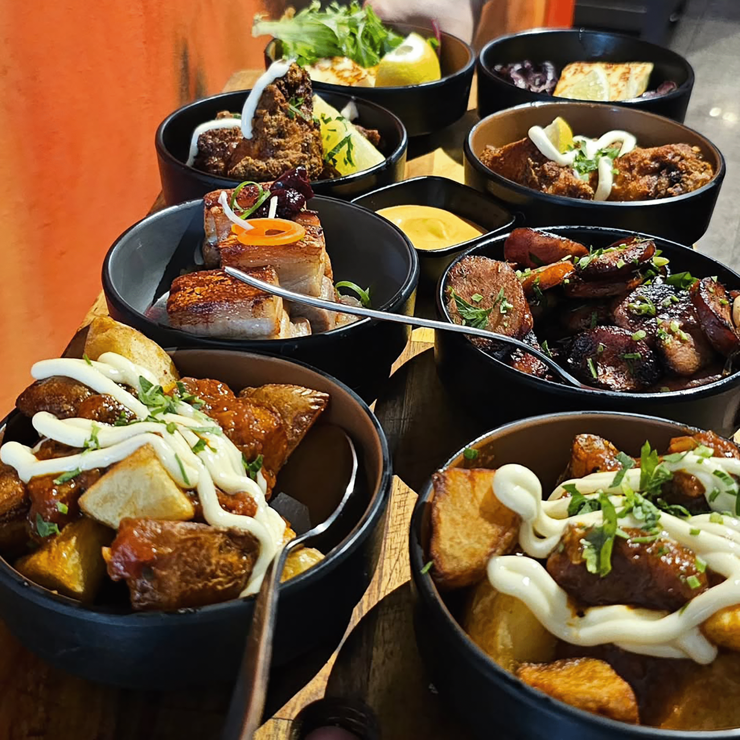 (Garlic Prawns+COD Crequettees+Calamari + Patatas Bravas, Salad + Pitta Bread+Soft Drink)